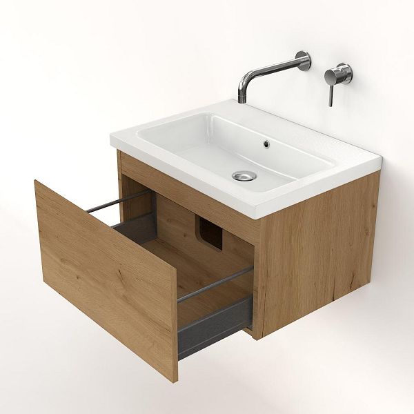 | Bellanti Solo/Amelia badmeubel 60x46 1 softclose lade eiken natuur greeploos keramische wastafel wit glans zonder kraangaten |