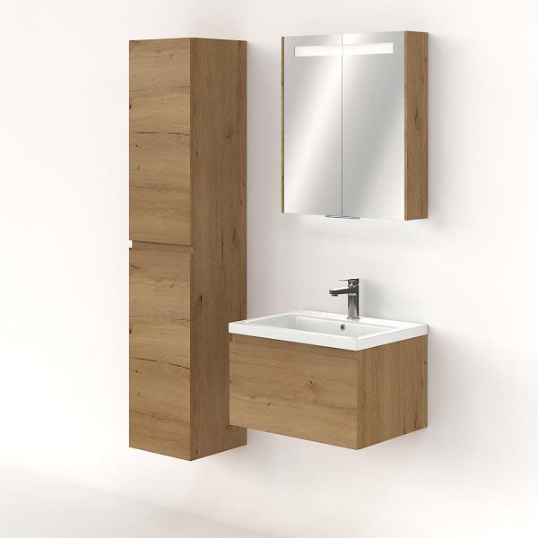Greeploos badkamermeubel in de kleur eiken natuur is 60 cm breed. De wastafel is vervaardig in keramiek en heeft de kleur wit keramiek. Dit badkamermeubel met deze wastafel is leverbaar tussen de 60 cm t/m 140 cm