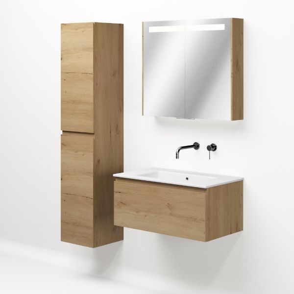 Greeploos badkamermeubel in de kleur eiken natuur is 80 cm breed. De wastafel is vervaardig in keramiek en heeft de kleur wit keramiek. Dit badkamermeubel met deze wastafel is leverbaar tussen de 60 cm t/m 120 cm