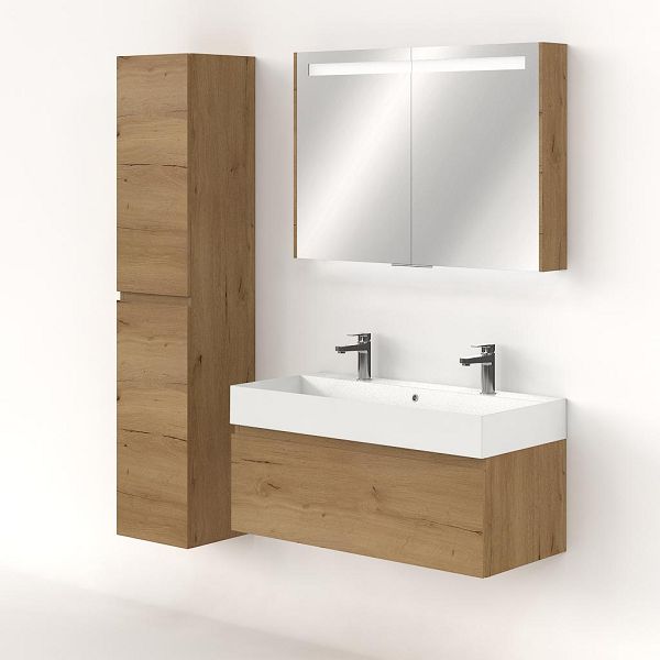 Greeploos badkamermeubel in de kleur eiken natuur is 100 cm breed. De wastafel is vervaardig in keramiek en heeft de kleur wit keramiek. Dit badkamermeubel met deze wastafel is leverbaar tussen de 60 cm t/m 160 cm