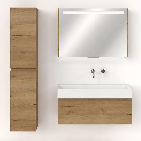 Greeploos badkamermeubel in de kleur eiken natuur is 100 cm breed. De wastafel is vervaardig in keramiek en heeft de kleur wit keramiek. Dit badkamermeubel met deze wastafel is leverbaar tussen de 60 cm t/m 160 cm