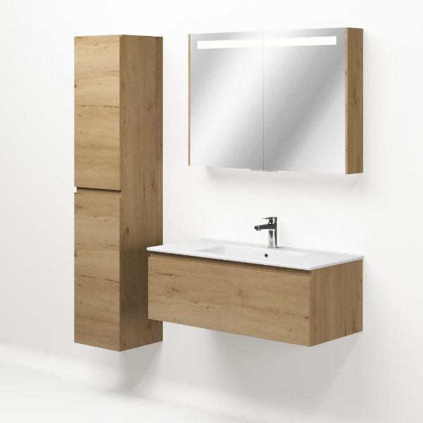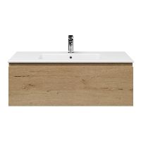 Greeploos badkamermeubel in de kleur eiken natuur is 100 cm breed. De wastafel is vervaardig in keramiek en heeft de kleur wit keramiek. Dit badkamermeubel met deze wastafel is leverbaar tussen de 60 cm t/m 120 cm