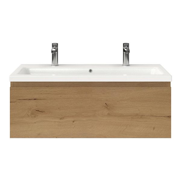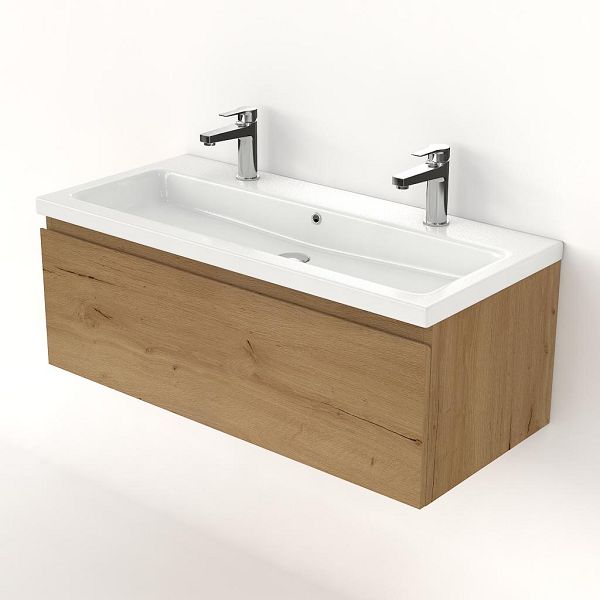 | | Bellanti Solo/Amelia badmeubel 100x46 1 softclose lade eiken natuur greeploos keramische wastafel wit glans met 2 kraangaten |