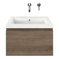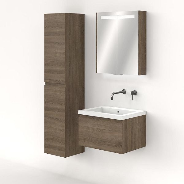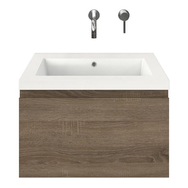 Greeploos badkamermeubel in de kleur eiken donker is 60 cm breed.  De wastafel is vervaardig in polystone en heeft de kleur wit. Dit badkamermeubel met deze wastafel is leverbaar tussen de 60 cm t/m 160 cm
