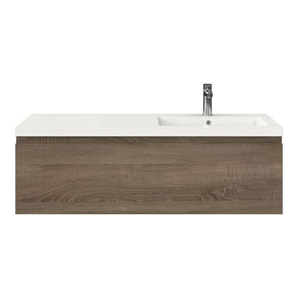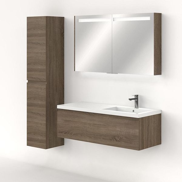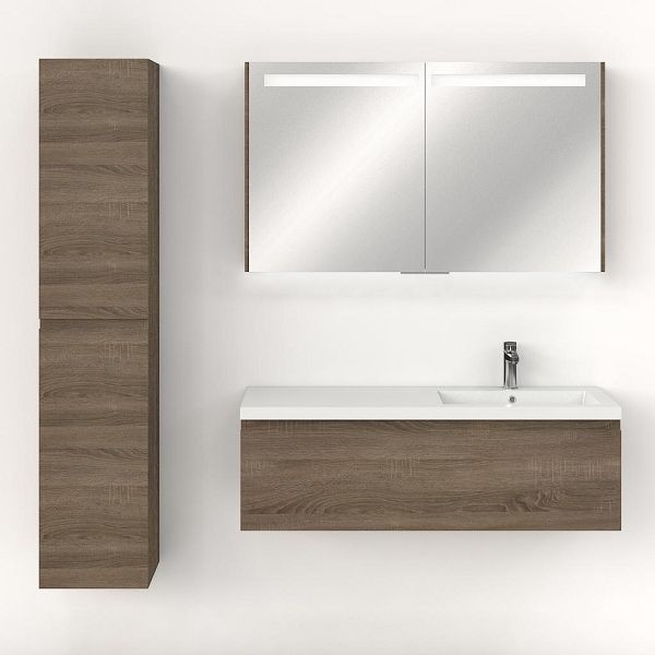 Greeploos badkamermeubel in de kleur eiken donker is 120 cm breed.  De wastafel is vervaardig in polystone en heeft de kleur wit. Dit badkamermeubel met deze wastafel is leverbaar tussen de 60 cm t/m 160 cm