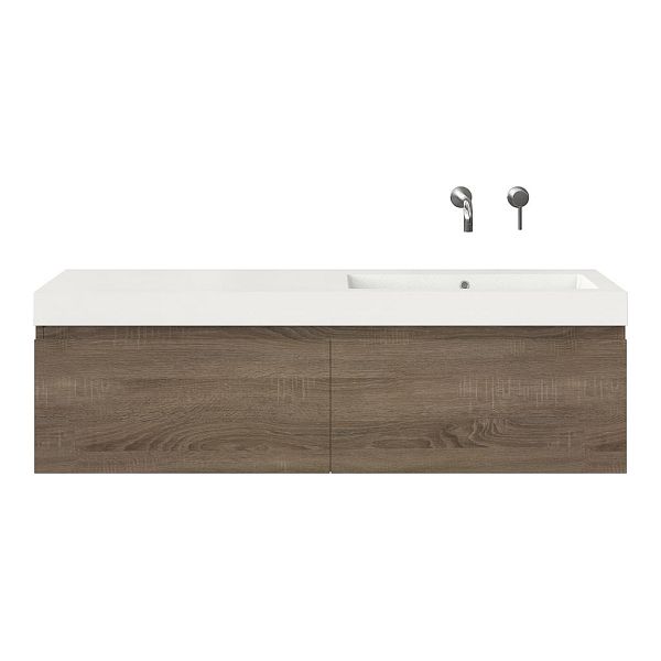Greeploos badkamermeubel in de kleur eiken donker is 140 cm breed.  De wastafel is vervaardig in polystone en heeft de kleur wit. Dit badkamermeubel met deze wastafel is leverbaar tussen de 60 cm t/m 160 cm