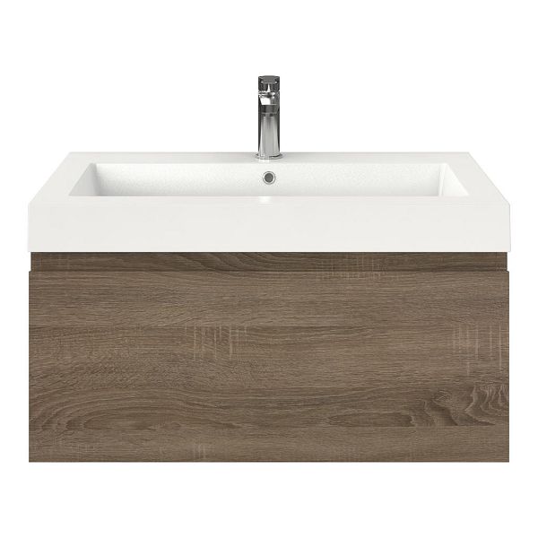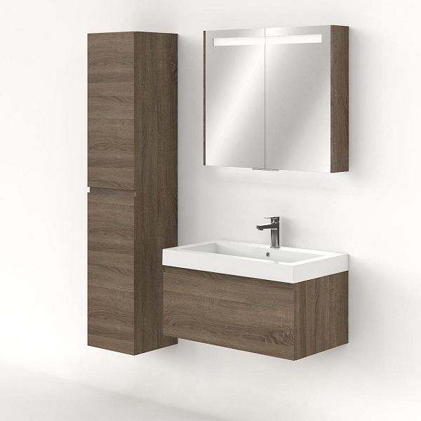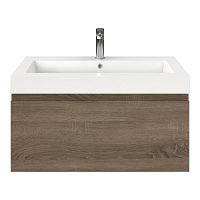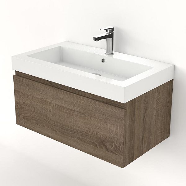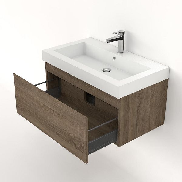 Greeploos badkamermeubel in de kleur eiken donker is 80 cm breed.  De wastafel is vervaardig in polystone en heeft de kleur wit. Dit badkamermeubel met deze wastafel is leverbaar tussen de 60 cm t/m 160 cm