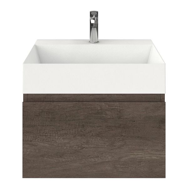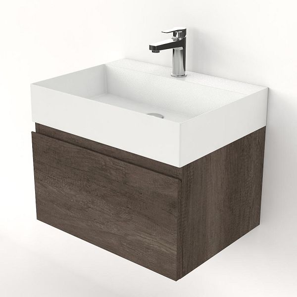 Greeploos badkamermeubel in de kleur olm donker grijs is 60 cm breed. De wastafel is vervaardig in keramiek en heeft de kleur wit mat keramiek. Dit badkamermeubel met deze wastafel is leverbaar tussen de 60 cm t/m 160 cm