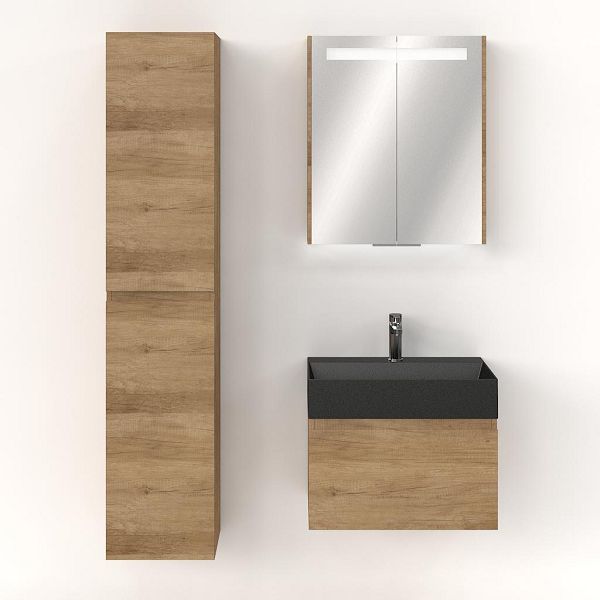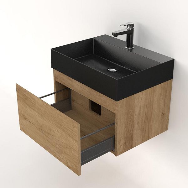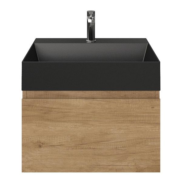 Greeploos badkamermeubel in de kleur olm is 60 cm breed. De wastafel is vervaardig in keramiek en heeft de kleur antraciet mat keramiek. Dit badkamermeubel met deze wastafel is leverbaar tussen de 60 cm t/m 160 cm