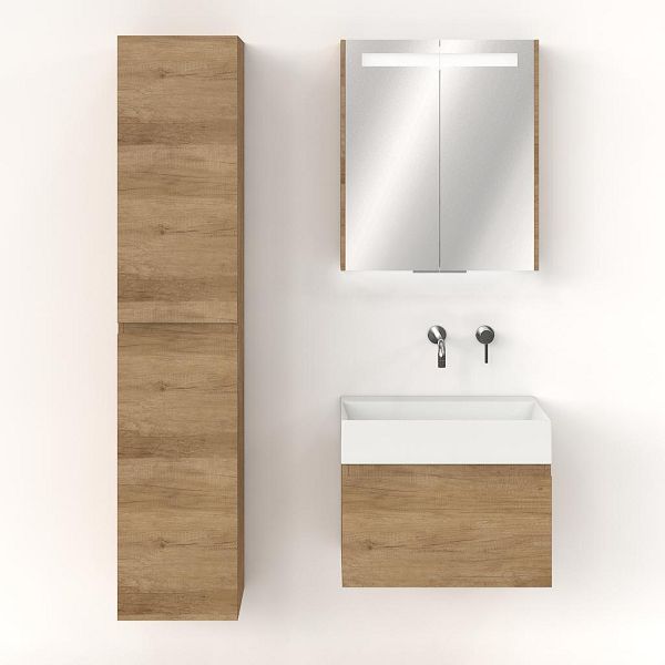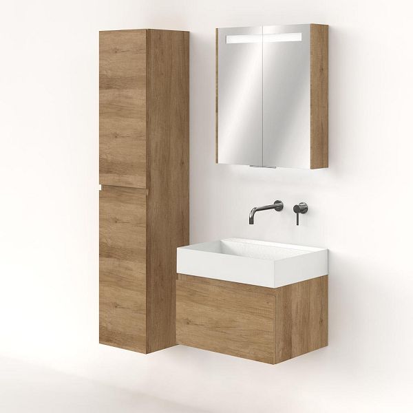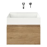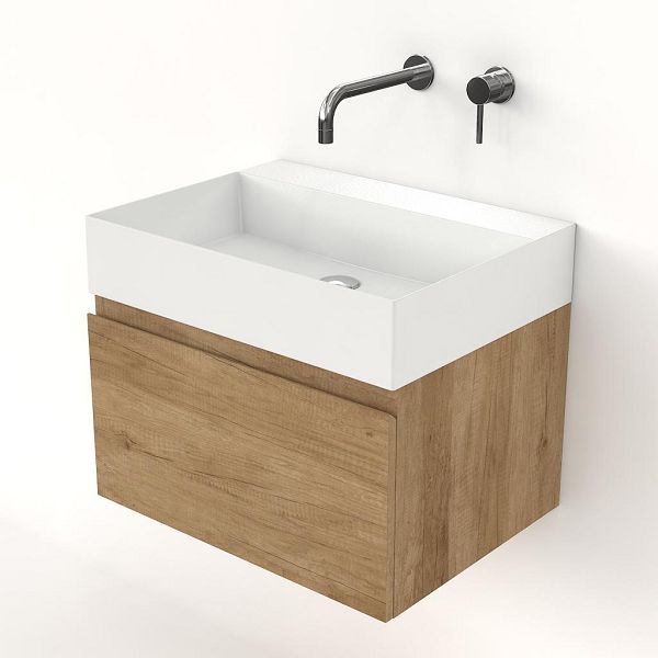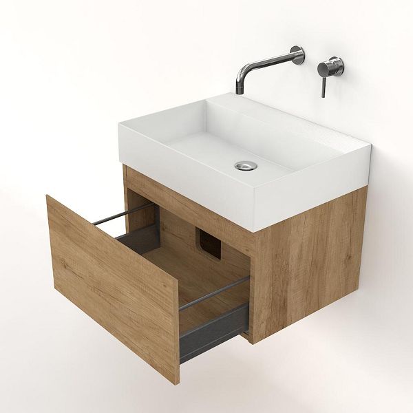 Greeploos badkamermeubel in de kleur olm is 60 cm breed. De wastafel is vervaardig in keramiek en heeft de kleur wit keramiek. Dit badkamermeubel met deze wastafel is leverbaar tussen de 60 cm t/m 160 cm