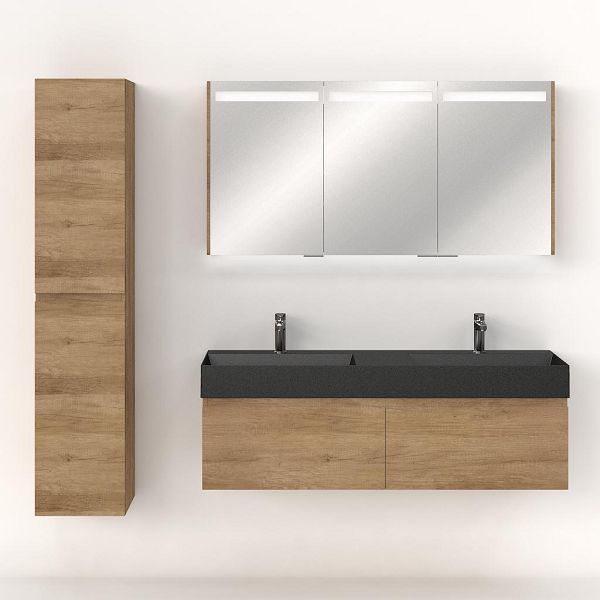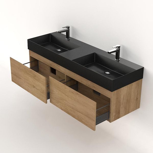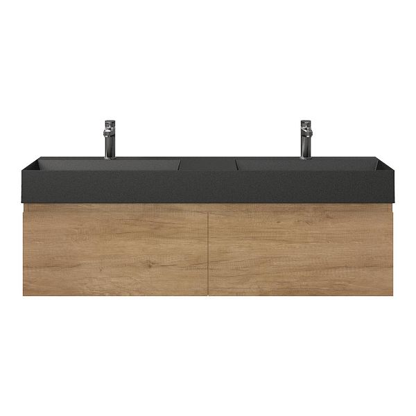 Greeploos badkamermeubel in de kleur olm is 140 cm breed. De wastafel is vervaardig in keramiek en heeft de kleur antraciet mat keramiek. Dit badkamermeubel met deze wastafel is leverbaar tussen de 60 cm t/m 160 cm