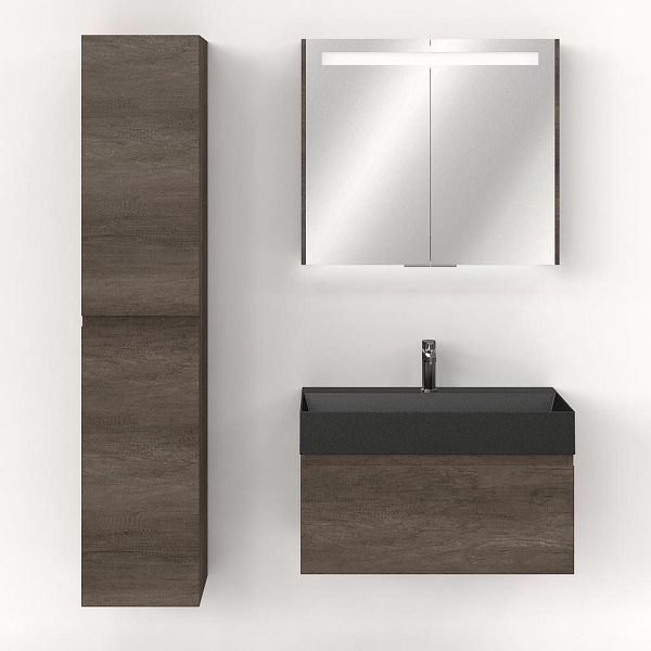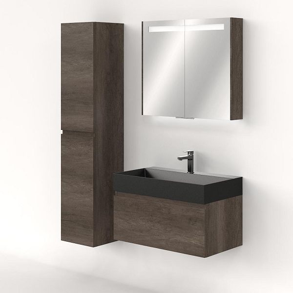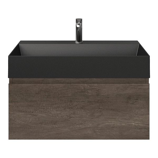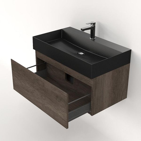 Greeploos badkamermeubel in de kleur olm donker grijs is 80 cm breed.  De wastafel is vervaardig in keramiek en heeft de kleur antraciet mat keramiek. Dit badkamermeubel met deze wastafel is leverbaar tussen de 60 cm t/m 160 cm