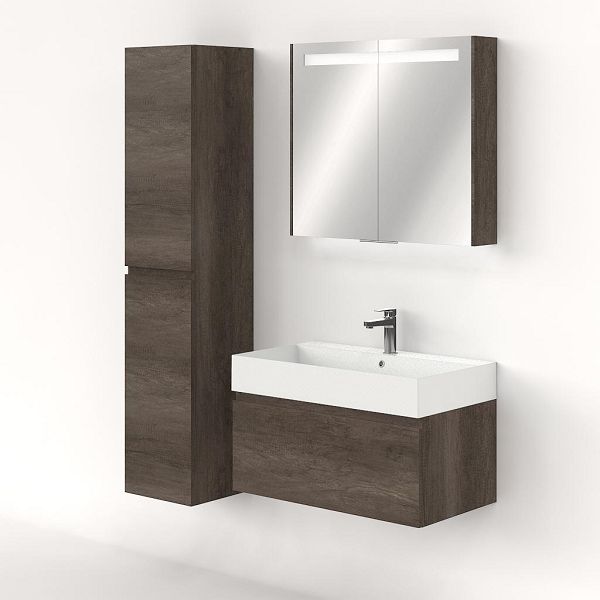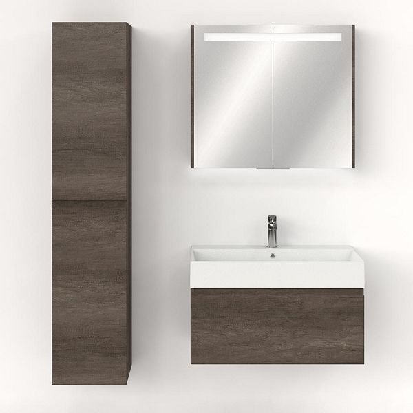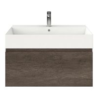 Greeploos badkamermeubel in de kleur olm donker grijs is 80 cm breed.  De wastafel is vervaardig in keramiek en heeft de kleur wit mat keramiek. Dit badkamermeubel met deze wastafel is leverbaar tussen de 60 cm t/m 160 cm