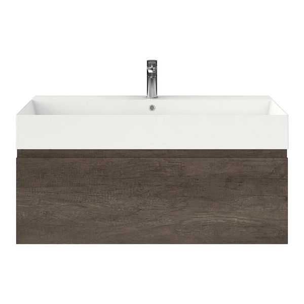 Greeploos badkamermeubel in de kleur olm donker grijs is 100 cm breed.  De wastafel is vervaardig in keramiek en heeft de kleur wit keramiek. Dit badkamermeubel met deze wastafel is leverbaar tussen de 60 cm t/m 160 cm