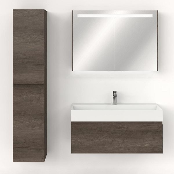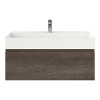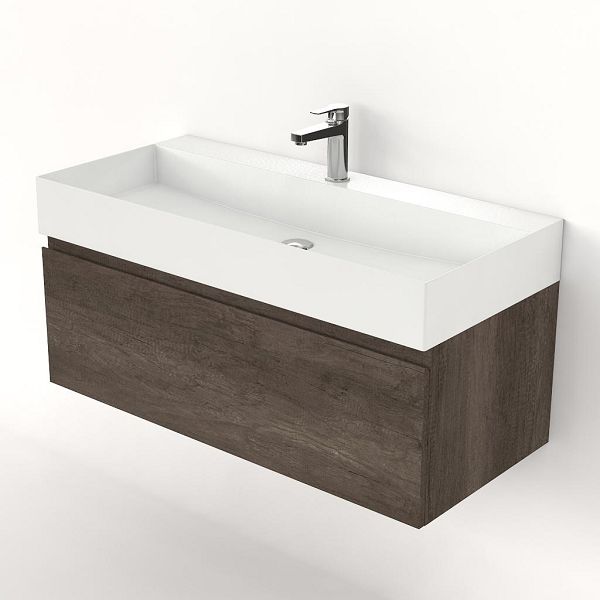 Greeploos badkamermeubel in de kleur olm donker grijs is 100 cm breed. De wastafel is vervaardig in keramiek en heeft de kleur wit keramiek. Dit badkamermeubel met deze wastafel is leverbaar tussen de 60 cm t/m 160 cm