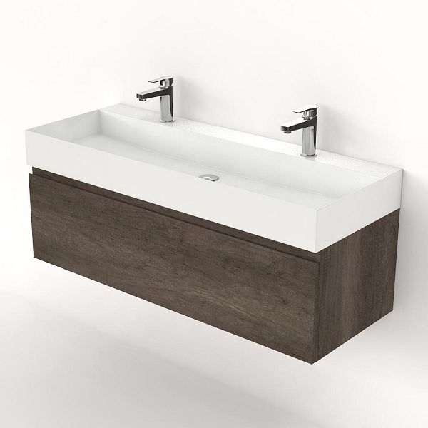 Greeploos badkamermeubel in de kleur olm donker grijs is 120 cm breed. De wastafel is vervaardig in keramiek en heeft de kleur wit keramiek. Dit badkamermeubel met deze wastafel is leverbaar tussen de 60 cm t/m 160 cm