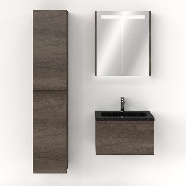 Greeploos badkamermeubel in de kleur olm donker grijs is 60 cm breed. De wastafel is vervaardig in natuursteen en heeft de kleur shanxi black. Dit badkamermeubel met deze wastafel is leverbaar tussen de 60 cm t/m 120 cm