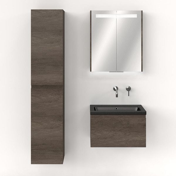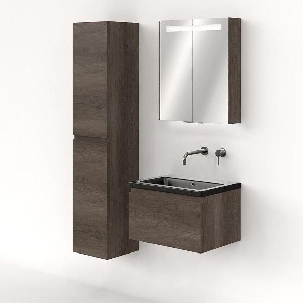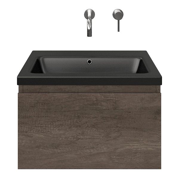 Greeploos badkamermeubel in de kleur olm donker grijs is 60 cm breed. De wastafel is vervaardig in keramiek en heeft de kleur zwart mat keramiek. Dit badkamermeubel met deze wastafel is leverbaar tussen de 60 cm t/m 140 cm