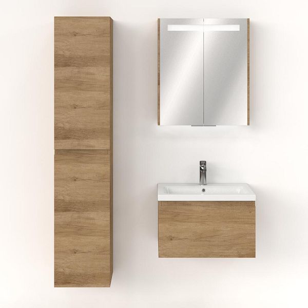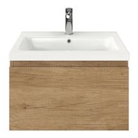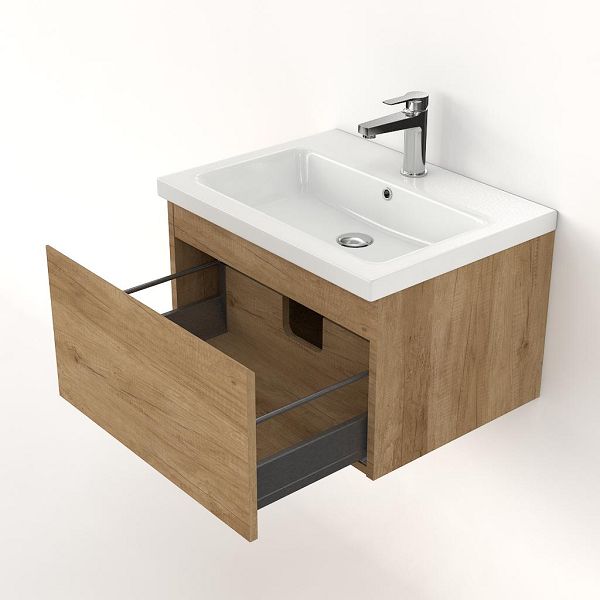 Greeploos badkamermeubel in de kleur olm is 60 cm breed. De wastafel is vervaardig in keramiek en heeft de kleur wit keramiek. Dit badkamermeubel met deze wastafel is leverbaar tussen de 60 cm t/m 140 cm