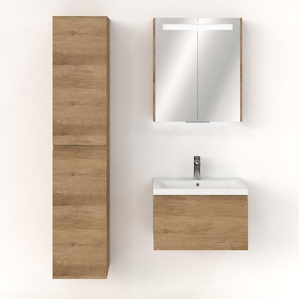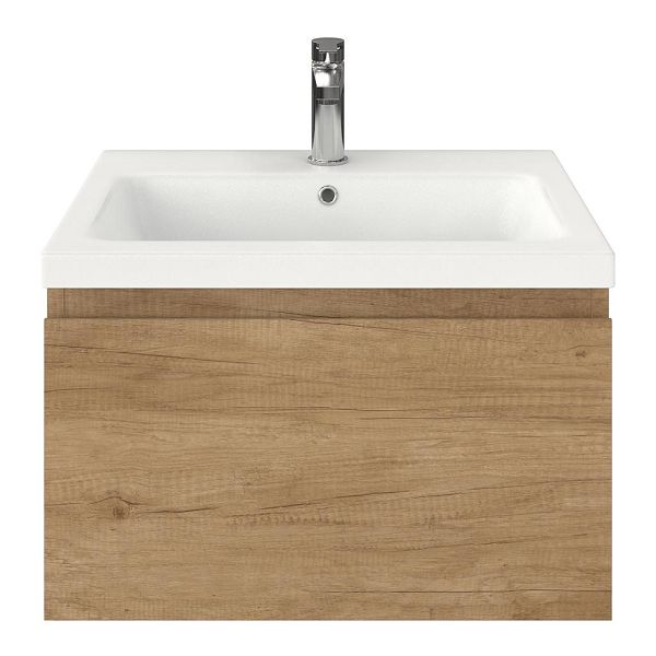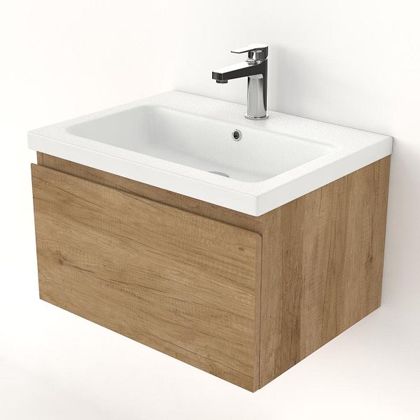 Greeploos badkamermeubel in de kleur olm is 60 cm breed. De wastafel is vervaardig in keramiek en heeft de kleur wit mat keramiek. Dit badkamermeubel met deze wastafel is leverbaar tussen de 60 cm t/m 140 cm