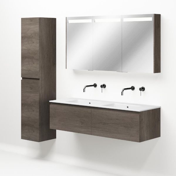 Greeploos badkamermeubel in de kleur olm donker grijs is 140 cm breed. De wastafel is vervaardig in keramiek en heeft de kleur wit keramiek. Dit badkamermeubel met deze wastafel is leverbaar tussen de 60 cm t/m 120 cm