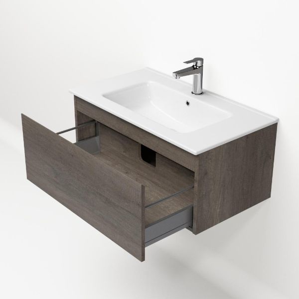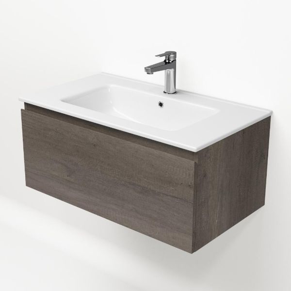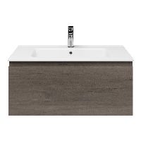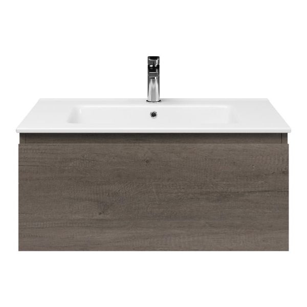 Greeploos badkamermeubel in de kleur olm donker grijs is 80 cm breed. De wastafel is vervaardig in keramiek en heeft de kleur wit keramiek. Dit badkamermeubel met deze wastafel is leverbaar tussen de 60 cm t/m 120 cm