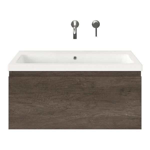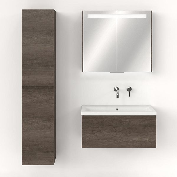 Greeploos badkamermeubel in de kleur olm donker grijs is 80 cm breed. De wastafel is vervaardig in keramiek en heeft de kleur wit mat keramiek. Dit badkamermeubel met deze wastafel is leverbaar tussen de 60 cm t/m 140 cm