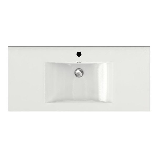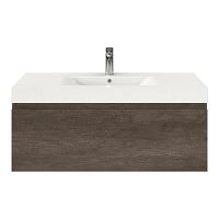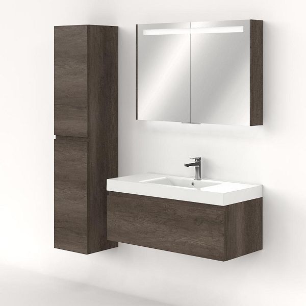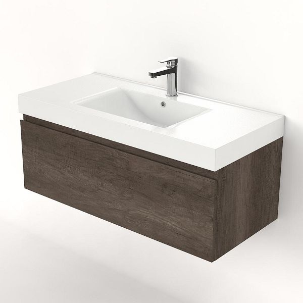 Greeploos badkamermeubel in de kleur olm donker grijs is 100 cm breed. De wastafel is vervaardig in polystone en heeft de kleur wit. Dit badkamermeubel met deze wastafel is leverbaar tussen de 60 cm t/m 120 cm
