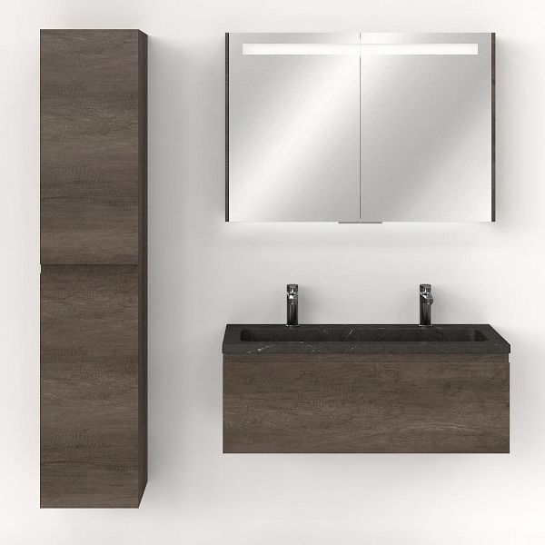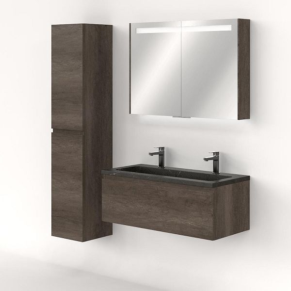Greeploos badkamermeubel in de kleur olm donker grijs is 100 cm breed. De wastafel is vervaardig in natuursteen en heeft de kleur blue stone. Dit badkamermeubel met deze wastafel is leverbaar tussen de 60 cm t/m 120 cm