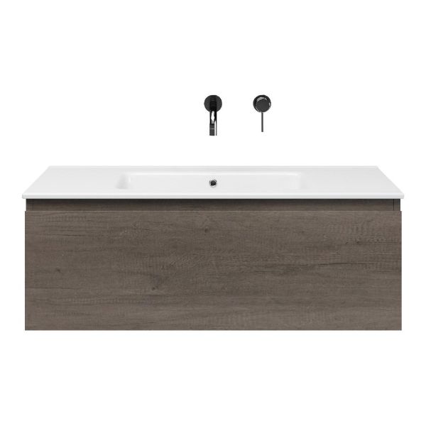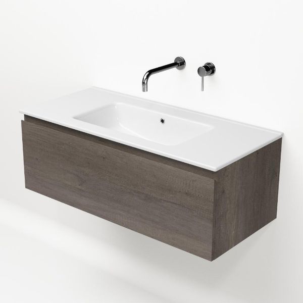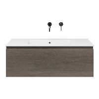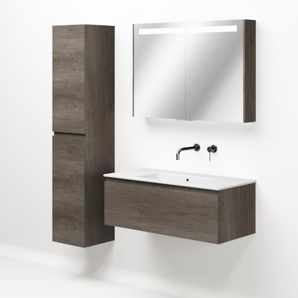 Greeploos badkamermeubel in de kleur olm donker grijs is 100 cm breed. De wastafel is vervaardig in keramiek en heeft de kleur wit keramiek. Dit badkamermeubel met deze wastafel is leverbaar tussen de 60 cm t/m 120 cm