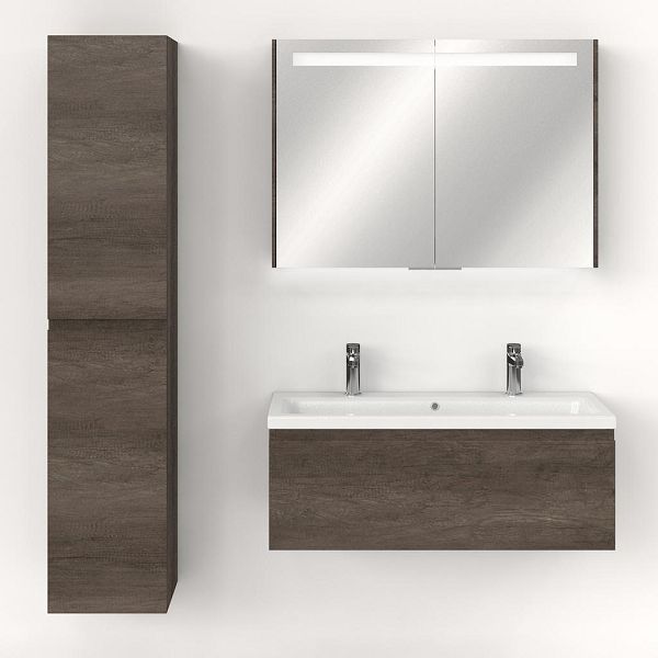 Greeploos badkamermeubel in de kleur olm donker grijs is 100 cm breed. De wastafel is vervaardig in keramiek en heeft de kleur wit keramiek. Dit badkamermeubel met deze wastafel is leverbaar tussen de 60 cm t/m 140 cm