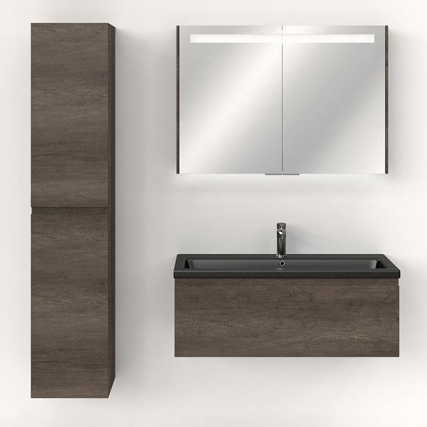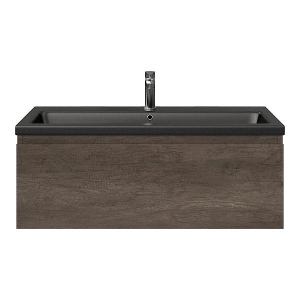 Greeploos badkamermeubel in de kleur olm donker grijs is 100 cm breed. De wastafel is vervaardig in keramiek en heeft de kleur zwart mat keramiek. Dit badkamermeubel met deze wastafel is leverbaar tussen de 60 cm t/m 140 cm