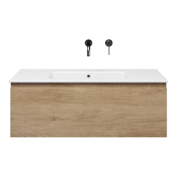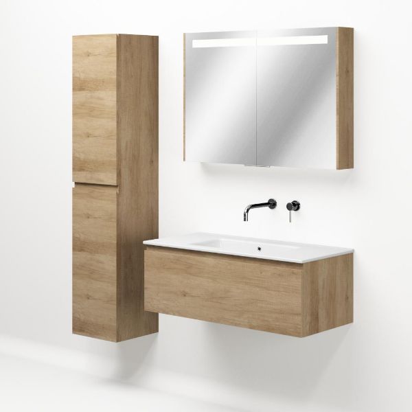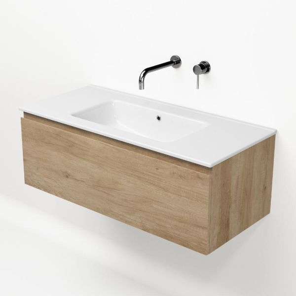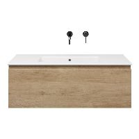 Greeploos badkamermeubel in de kleur olm is 100 cm breed. De wastafel is vervaardig in keramiek en heeft de kleur wit keramiek. Dit badkamermeubel met deze wastafel is leverbaar tussen de 60 cm t/m 120 cm