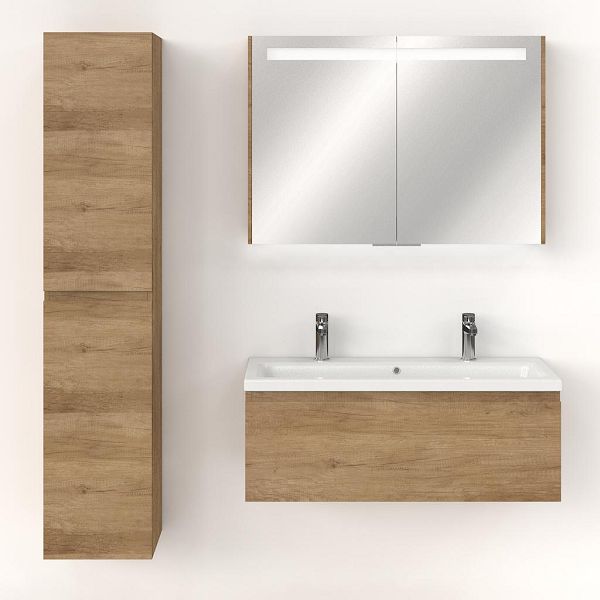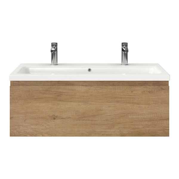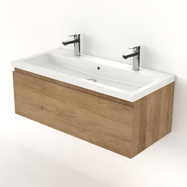 Greeploos badkamermeubel in de kleur olm is 100 cm breed. De wastafel is vervaardig in keramiek en heeft de kleur wit keramiek. Dit badkamermeubel met deze wastafel is leverbaar tussen de 60 cm t/m 140 cm