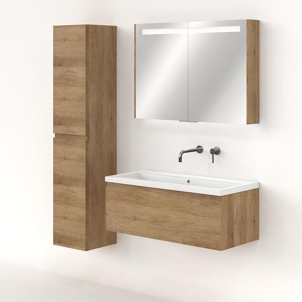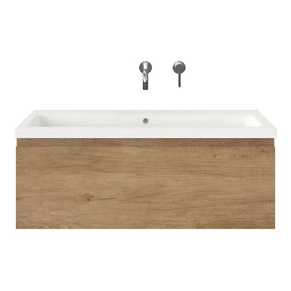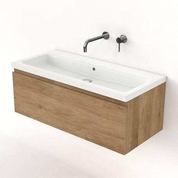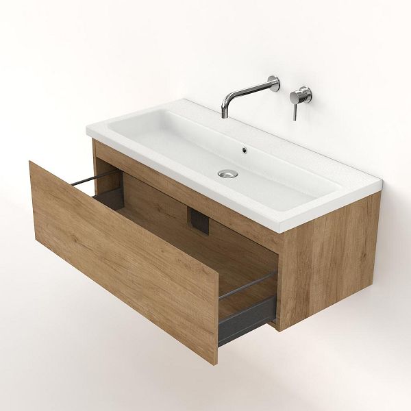 Greeploos badkamermeubel in de kleur olm is 100 cm breed. De wastafel is vervaardig in keramiek en heeft de kleur wit mat keramiek. Dit badkamermeubel met deze wastafel is leverbaar tussen de 60 cm t/m 140 cm