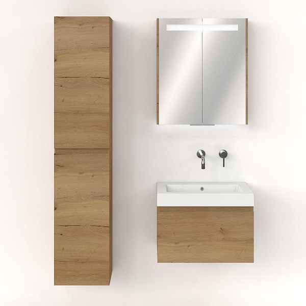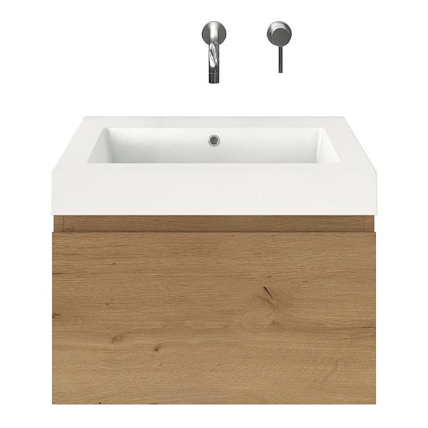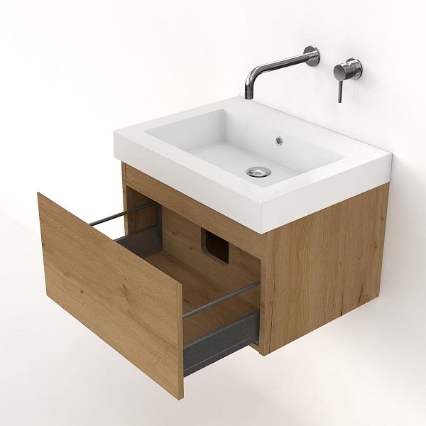 Greeploos badkamermeubel in de kleur eiken natuur is 60 cm breed.  De wastafel is vervaardig in polystone en heeft de kleur wit. Dit badkamermeubel met deze wastafel is leverbaar tussen de 60 cm t/m 160 cm