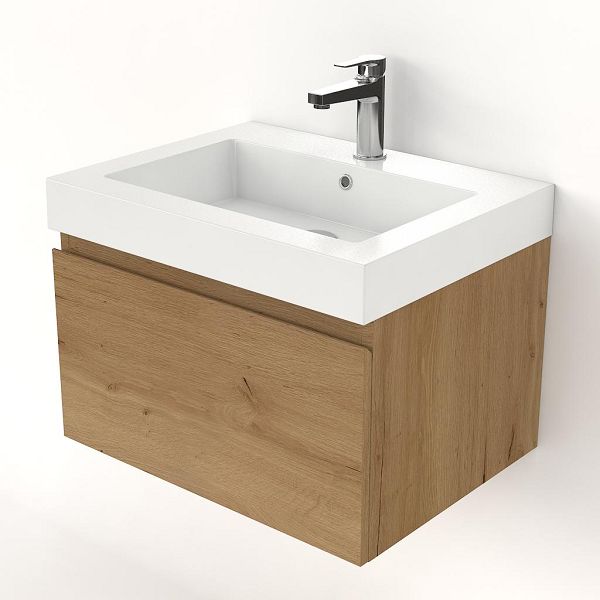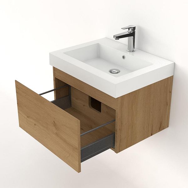 Greeploos badkamermeubel in de kleur eiken natuur is 60 cm breed. De wastafel is vervaardig in polystone en heeft de kleur wit. Dit badkamermeubel met deze wastafel is leverbaar tussen de 60 cm t/m 160 cm