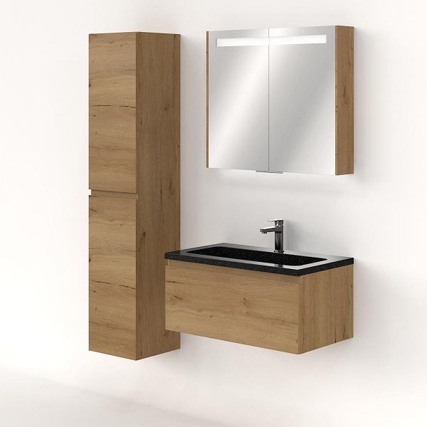 Greeploos badkamermeubel in de kleur eiken natuur is 80 cm breed. De wastafel is vervaardig in natuursteen en heeft de kleur shanxi black. Dit badkamermeubel met deze wastafel is leverbaar tussen de 60 cm t/m 120 cm