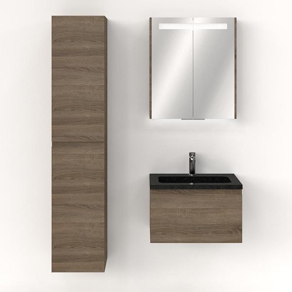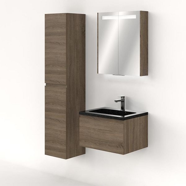 Greeploos badkamermeubel in de kleur eiken donker is 60 cm breed. De wastafel is vervaardig in natuursteen en heeft de kleur shanxi black. Dit badkamermeubel met deze wastafel is leverbaar tussen de 60 cm t/m 120 cm