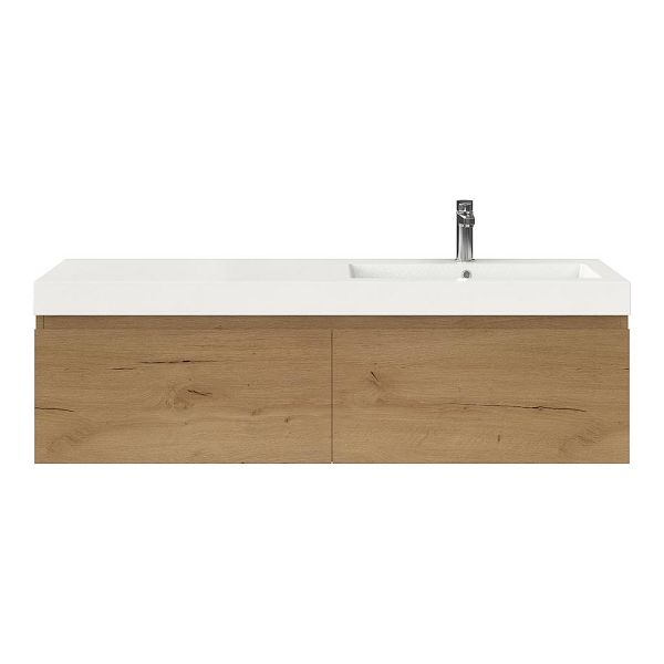 Greeploos badkamermeubel in de kleur eiken natuur is 140 cm breed. De wastafel is vervaardig in polystone en heeft de kleur wit. Dit badkamermeubel met deze wastafel is leverbaar tussen de 60 cm t/m 160 cm