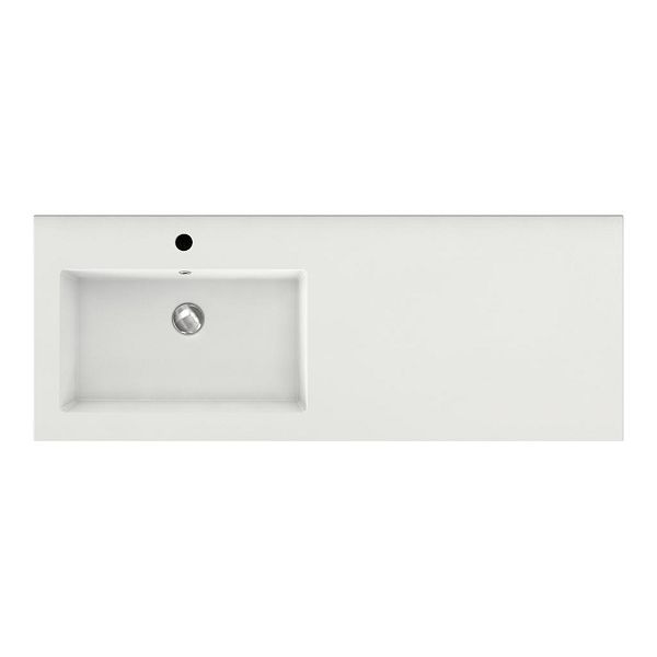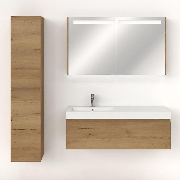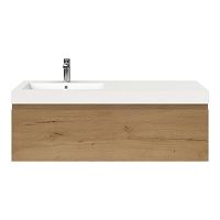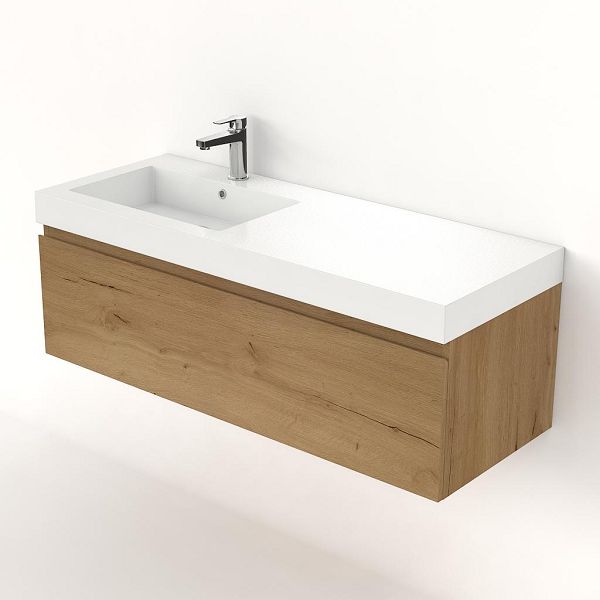 Greeploos badkamermeubel in de kleur eiken natuur is 120 cm breed.  De wastafel is vervaardig in polystone en heeft de kleur wit. Dit badkamermeubel met deze wastafel is leverbaar tussen de 60 cm t/m 160 cm