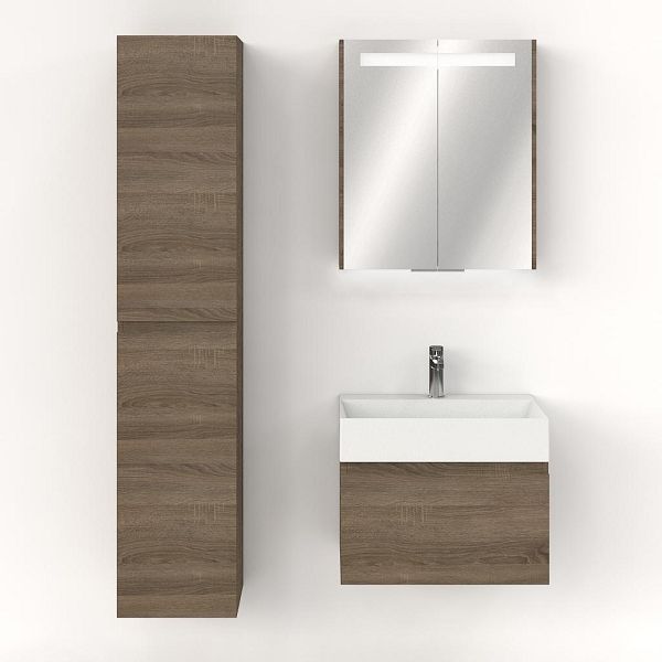 Greeploos badkamermeubel in de kleur eiken donker is 60 cm breed. De wastafel is vervaardig in keramiek en heeft de kleur wit mat keramiek. Dit badkamermeubel met deze wastafel is leverbaar tussen de 60 cm t/m 160 cm