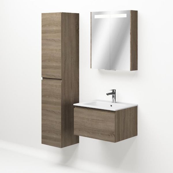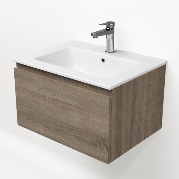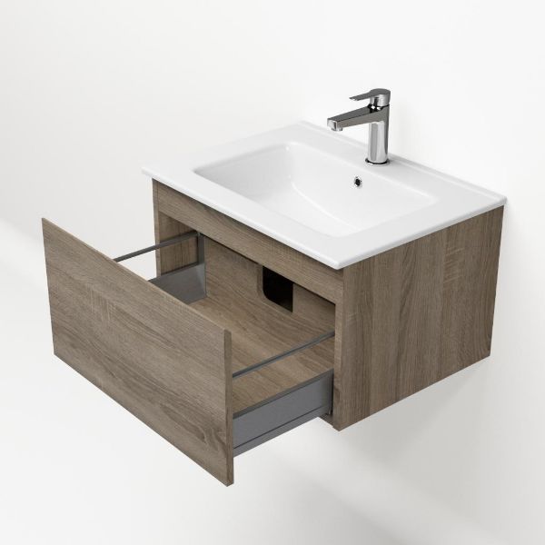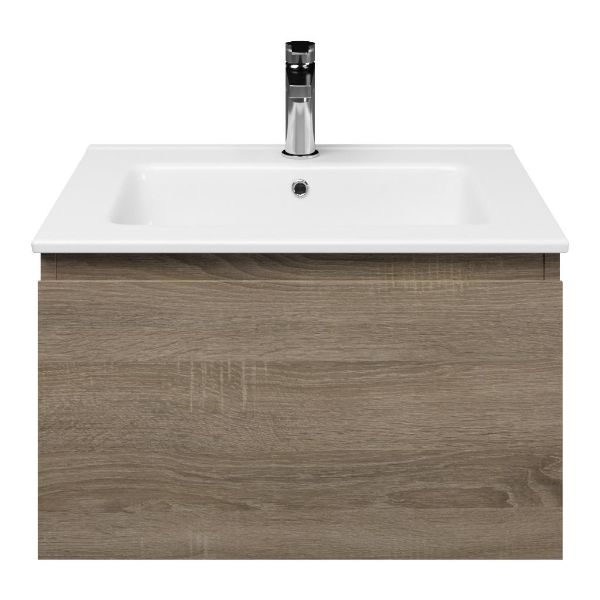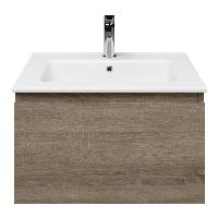 Greeploos badkamermeubel in de kleur eiken donker is 60 cm breed. De wastafel is vervaardig in keramiek en heeft de kleur wit keramiek. Dit badkamermeubel met deze wastafel is leverbaar tussen de 60 cm t/m 120 cm