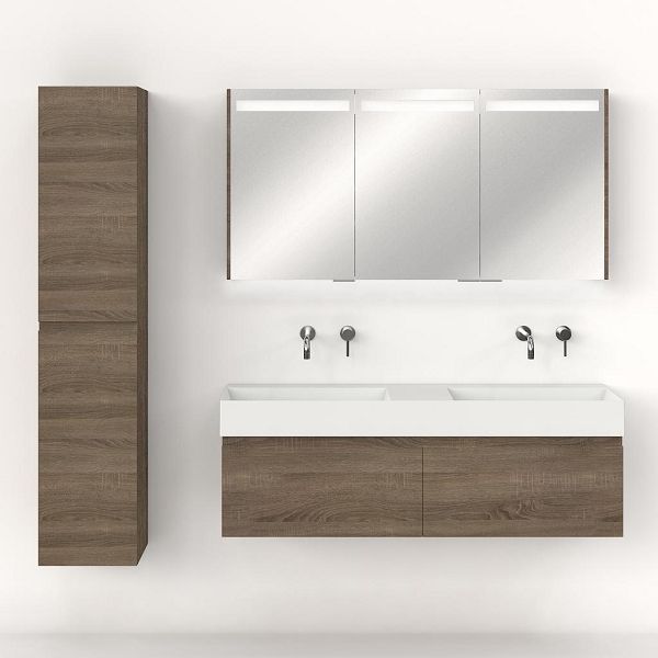 Greeploos badkamermeubel in de kleur eiken donker is 140 cm breed. De wastafel is vervaardig in keramiek en heeft de kleur wit keramiek. Dit badkamermeubel met deze wastafel is leverbaar tussen de 60 cm t/m 160 cm