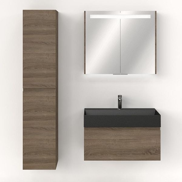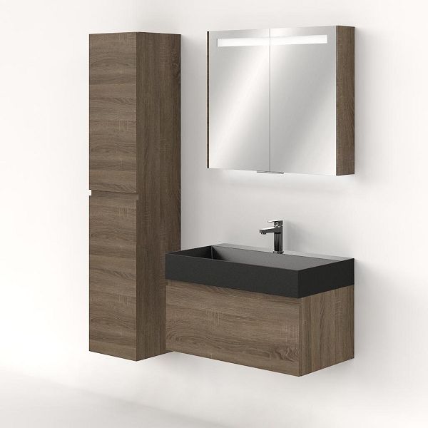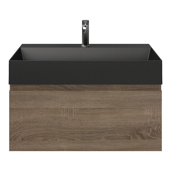 Greeploos badkamermeubel in de kleur eiken donker is 80 cm breed.  De wastafel is vervaardig in keramiek en heeft de kleur antraciet mat keramiek. Dit badkamermeubel met deze wastafel is leverbaar tussen de 60 cm t/m 160 cm