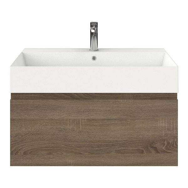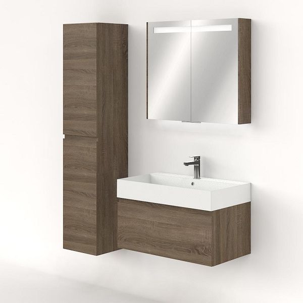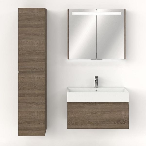 Greeploos badkamermeubel in de kleur eiken donker is 80 cm breed. De wastafel is vervaardig in keramiek en heeft de kleur wit mat keramiek. Dit badkamermeubel met deze wastafel is leverbaar tussen de 60 cm t/m 160 cm