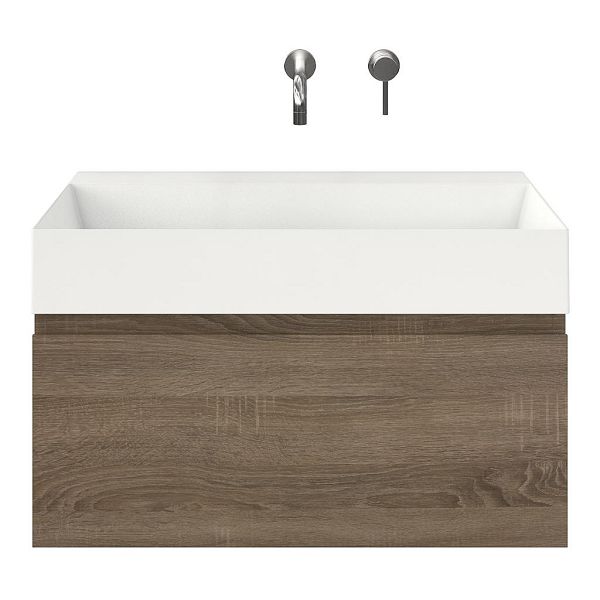 Greeploos badkamermeubel in de kleur eiken donker is 80 cm breed. De wastafel is vervaardig in keramiek en heeft de kleur wit keramiek. Dit badkamermeubel met deze wastafel is leverbaar tussen de 60 cm t/m 160 cm