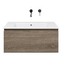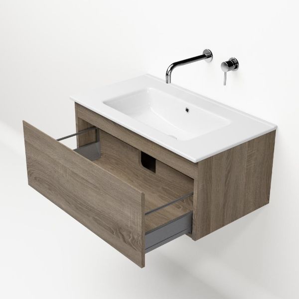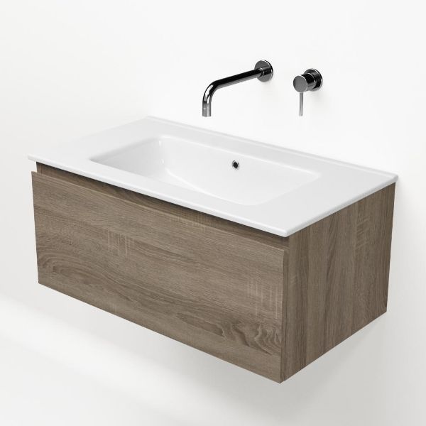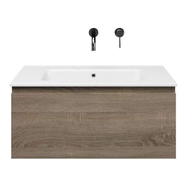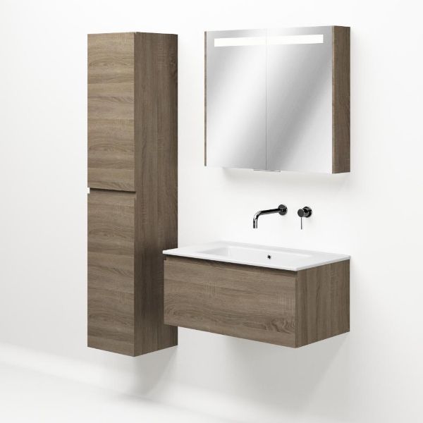 Greeploos badkamermeubel in de kleur eiken donker is 80 cm breed. De wastafel is vervaardig in keramiek en heeft de kleur wit keramiek. Dit badkamermeubel met deze wastafel is leverbaar tussen de 60 cm t/m 120 cm