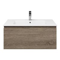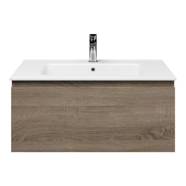 Greeploos badkamermeubel in de kleur eiken donker is 80 cm breed. De wastafel is vervaardig in keramiek en heeft de kleur wit keramiek. Dit badkamermeubel met deze wastafel is leverbaar tussen de 60 cm t/m 120 cm