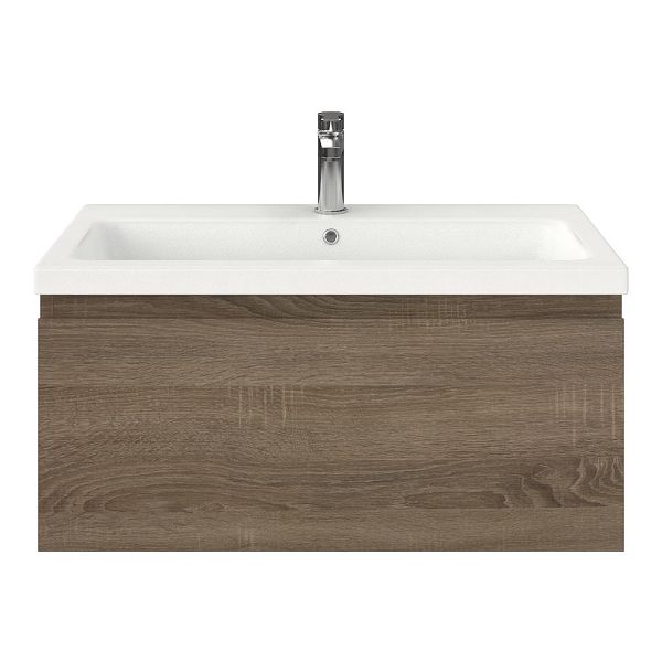 Greeploos badkamermeubel in de kleur eiken donker is 80 cm breed. De wastafel is vervaardig in keramiek en heeft de kleur wit mat keramiek. Dit badkamermeubel met deze wastafel is leverbaar tussen de 60 cm t/m 140 cm